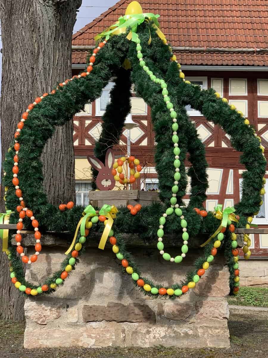 Zum Osterfest werden die Brunnen in der Gemeinde von vielen ehrenamtlichen Helfern festlich geschmückt.